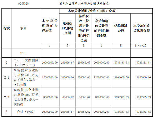 第一步,先填报一次性扣除情况。对于单价500万元以下设备、器具,在《资产加速折旧、摊销(扣除)优惠明细表》(A201020)第2行“二、一次性扣除”下的明细行次中填写“高新技术企业购进单价500万元以下设备、器具一次性扣除”事项及“本年享受优惠的资产原值”等信息;对于单价500万元以上设备、器具,填写“高新技术企业购进单价500万元以上设备、器具一次性扣除”事项及“本年享受优惠的资产原值”等信息。填写完毕后,将该表单中“纳税调减金额”列次的合计值(第3行第5列)填写在《中华人民共和国企业所得税月(季)度预缴纳税申报表(A类)》(A202000)第6行“资产加速折旧、摊销(扣除)调减额(填写A201020)”中。