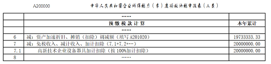 第二步,填报加计扣除情况。在《中华人民共和国企业所得税月(季)度预缴纳税申报表(A类)》(A200000)第7行“减:免税收入、减计收入、加计扣除”下的明细行次中,填写“高新技术企业设备、器具加计扣除(按100%加计扣除)”事项及加计扣除金额。表单节选部分填报如下: