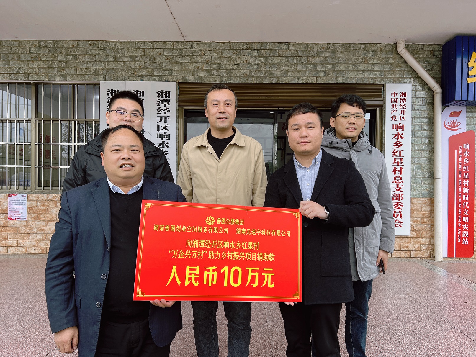11月29日,湖南善圈企服集团通过其所属企业湖南善圈创业空间服务有限公司、湖南元速字科技有限公司,向湘潭市经开区响水乡红星村捐赠人民币10万元,助力乡村振兴事业发展。