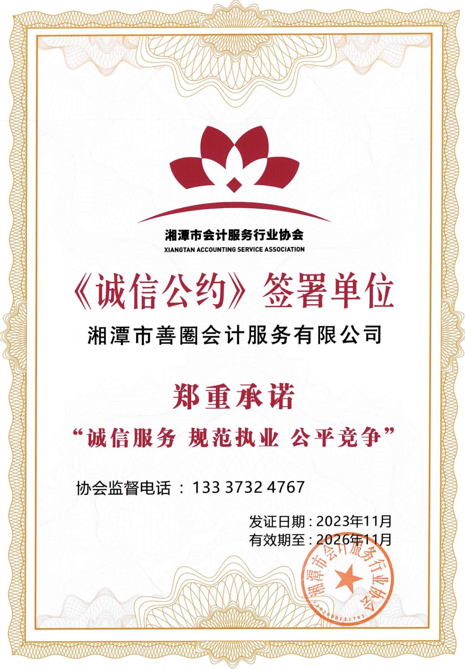 同时,善圈会计荣获湘潭市会计服务行业协会“最佳财税机构”,并签署了《湘潭市会计协会行业诚信公约》。共同营造“诚信经营、公平竞争、规范执业”的行业氛围!